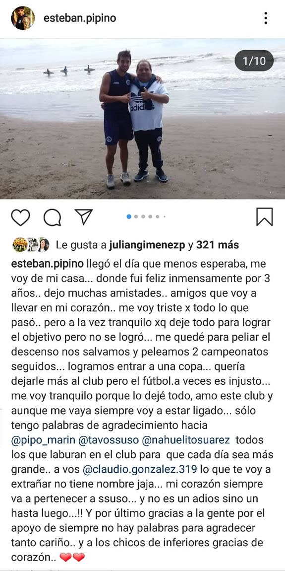 “Me voy triste por todo lo que pasó, pero a la vez tranquilo porque dejé todo para lograr el objetivo pero no se logró. Quería dejarle más al club, pero el fútbol a veces es injusto”, añadió el ex Fénix. Y admitió: “Mi corazón siempre va a pertenecer a Ssuso y no es un adiós, sino un hasta luego”.