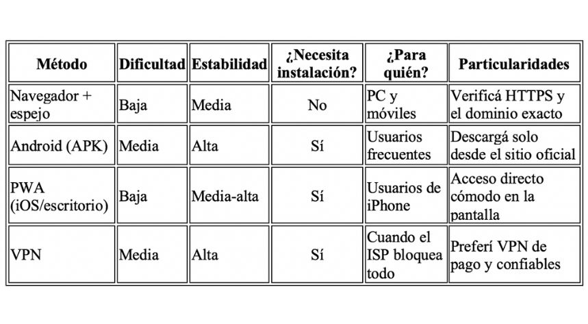 - Consejo: si los espejos no abren, probá la app (APK) o la PWA para iOS: suelen ser más estables.